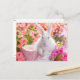 Animal card showing a cute hare in a basket within a bed of flowers.