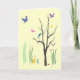 This note card creates a colourful, whimsical spring mood. Birds are flying and are perched in the tree. Butterflies hover in the warm air. A duck waddles in the grass. There is even a tiny snail on the ground. The design is repeated inside.