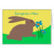Springtime is Here. Spring season greeting card with an illustration of a rabbit with long ears taking time to smell a blue and orange flower. Bright and bold design in yellow, green, blue, and orange. Image and verse copyright © Shoaff Ballanger Studios.
