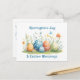 Celebrate the beauty of the season with this elegant postcard, designed to spread Easter cheer. The front features a charming vector illustration of pastel-coloured Easter eggs nestled among delicate wildflowers, creating a soft and inviting springtime scene. The gentle colour palette adds a fresh, joyful touch, perfect for Easter well-wishes.