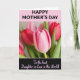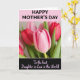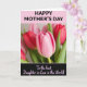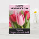 This greeting card shows a close-up photo of spring flowers, mostly tulips, in soft pinks and deeper rosy tones, arranged like a bouquet being offered with quiet affection ❤️. A pale pink tulip sits in the foreground, its petals gently opening with fine lines that catch the light, like a tender moment held still. Behind it, darker pink and red blooms blur into the background, creating a cosy, intimate setting that feels like someone leaning in close. Fresh green stems and leaves cut through the pinks, adding contrast and a just-picked look. At the top, a pastel banner runs across the width with bold lettering in a darker shade for easy reading. Along the bottom, a deeper-coloured panel holds a flowing, cursive-style message in a lighter tone, giving the layout a warm, note-like touch 🌼. The lighting is soft and even, with a gentle glow that brightens the petals without harsh shadows. The top band is light and airy, while the bottom band is darker and more grounded, framing the flowers in the centre.