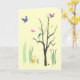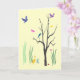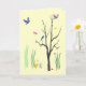 This friendship card creates a colourful, whimsical spring mood. Birds are flying and are perched in the tree. Butterflies hover in the warm air. A duck waddles in the grass. There is even a tiny snail on the ground. The design is repeated inside. The text reads: Just thinking of you... It can be customised to suit your needs.