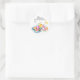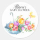 Beautiful watercolor tulips adorning an umbrella baby shower round sticker.