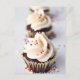 A modern photograph of three cupcakes in a row. Each chocolate cupcake has yummy vanilla frosting and rainbow sparkles.