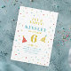 A whimsical kids birthday party invitation featuring rainbow sprinkles, large name and age and party hats.