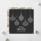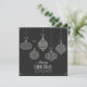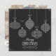 Black background with white modern style, decorative Christmas balls on strings with small bows, Merry Christmas sentiment and white decorative frame. Back side has photo and text you can customise.