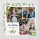 Square photo collage Christmas card with greenery twigs with white flowers and blue berries framing three photos of your family and Merry Christmas in dark blue.