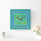 A square Wall Clock, with a 'Blue Moons' mix'n'match pattern of Chevrons and Polka Dots in Dazzling Blue, Neon Green, Turquoise and Emerald Green. Part of the Posh & Painterly 'Blue Moons' collection; from a handpainted paper collage design by Judy Adamson.