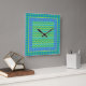 A square Wall Clock, with a 'Blue Moons' mix'n'match pattern of Chevrons and Polka Dots in Dazzling Blue, Neon Green, Turquoise and Emerald Green. Part of the Posh & Painterly 'Blue Moons' collection; from a handpainted paper collage design by Judy Adamson.