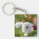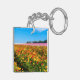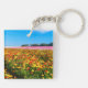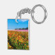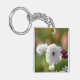 Double sided keychain with with a picture on side of the flower fields and a picture of a white ranunclus on the other side.