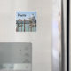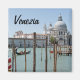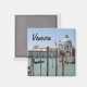 Square souvenir magnet for on the fridge with gondolas and gondoliers on the water of the Canal Grande with the Santa Maria della Salute church in the background creating a romantic city landscape during the summer holidays in Venice, Italy with the text: 'Venezia'.
