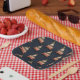 Modern small square paper plate with a midnight blue background and Christmas tree pattern in red and green. Great for snacks or desserts. Complements the large square and round plates for a holiday tableware collection.