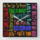 A truly unique wall clock featuring various sayings about time. such as, "Time flies" or "Time is Money," and so in, each in a different lettering in very bright colours on black. Blue dots mark the hours.