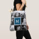 Square Photo Collage Navy Monogrammed Custom Tote Bag. Personalise this custom design with up to 8 photos and your own unique monogram initial or custom text.