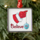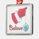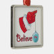 This whimsical square shaped design has a Santa hand with a blue ornament dangling from the end of a string. There is customisable text on the blue ornament for you to add the year. Additional colourful text reads: "Believe". This design makes a great gift for "believers" of any age!