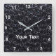 A square wall clock with a beautiful black pattern.