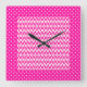 A pretty, square Wall Clock with a pattern of decorative chevron shapes and polka dots in candy pink and white.