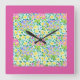 A very pretty square Wall Clock, with a pattern of pink, yellow and blue primroses, from a handpainted watercolour design by Judy Adamson. This clock's border is in Pink but other colours are available.