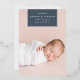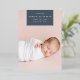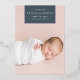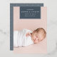 Chic and modern birth announcement features a single full bleed vertical/portrait orientated photo with a rectangular banner element at the top, bearing baby's name, birthdate, and birth stats, and trimmed with silver foil. Add a personal message to the back, along with an additional photo.