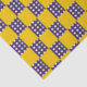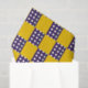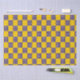 A pattern of alternating yellow and blue squares creates a chequerboard effect. Blue squares are dotted with white circles, adding a playful contrast to the bright yellow.