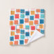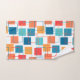 This towel set has a geometric design of squares in tangerine, poppy, coral, and shades of teal scattered about with their outlines.