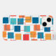 This phone case has a geometric design of squares in tangerine, poppy, coral, and shades of teal scattered about with their outlines.