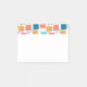 This Post-It notepad has a geometric design of squares in tangerine, poppy, coral, and shades of teal scattered about with their outlines.