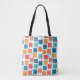 This tote bag has a geometric design of squares in coral, orange, yellow, and blues scattered about with their outlines.