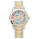 This men's watch has a geometric design of squares in tangerine, poppy, coral, and shades of teal scattered about with their outlines.