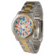 This women's watch has a geometric design of squares in tangerine, poppy, coral, and shades of teal scattered about with their outlines.