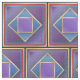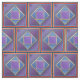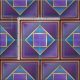 This bold pattern has a purple centre, outlined by gold, against a blue background with a texture created by varying shades of blue, then outlined by nested colours of gold, deep purple, blue, red, gold then outlined in a solid dark blue. The squares are patterned into a half brick for additional visual interest.