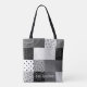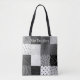squares of patterned black and white patchwork tote bag