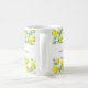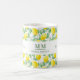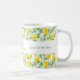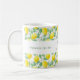A mug decorated with a lemon pattern. Text: Squeeze the day. Personalise and add your monogram initials and name.