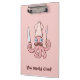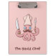 Pink squid chef cartoon with moustache holding knife and cooking fork. Custom background colour. Custom text. Seamless pattern at back side.