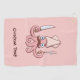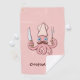 Pink squid chef cartoon with moustache holding knife and cooking fork. Custom background colour. Custom text.