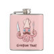 Pink squid chef cartoon with moustache holding knife and cooking fork. Custom background colour. Custom text.