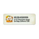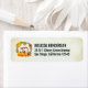 Return address labels with a cute squirrel standing behind some orange watercolor pumpkins. A foliage wreath surrounds them with an oak leaf and orange flowers and other sprigs and leaves. Background is a cream colour, with a rough aged look around the edges.