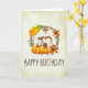 A happy birthday card perfect for the fall season. Designed with a cute squirrel standing behind some orange watercolor pumpkins. A foliage wreath surrounds them with an oak leaf and orange flowers and other sprigs and leaves. TBackground is a faux vintage parchment in a cream colour, with a rough aged look. Inside the card is a message you can personalise.
