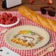 A paper plate with a cute chipmunk standing behind some orange watercolor pumpkins. A foliage wreath surrounds them with an oak leaf and orange flowers and other sprigs and leaves.