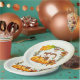 A paper plate with a cute chipmunk standing behind some orange watercolor pumpkins. A foliage wreath surrounds them with an oak leaf and orange flowers and other sprigs and leaves. Background is a faux vintage parchment in a cream colour, with a rough aged look.