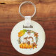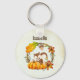 Personalised keychain with a cute squirrel standing behind some orange watercolor pumpkins. A foliage wreath surrounds them with an oak leaf and orange flowers and other sprigs and leaves. Background is a cream colour, with a rough aged look around the edges.