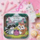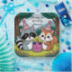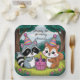 An adorable baby's first birthday paper plates with a forest animal theme. A cute racoon and squirrel holding a blackberry cupcake wearing birthday hats.
