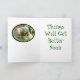 Greeting card features photo of squirrel clinging for all he's got to a bird feeder and looking straight into camera. Text. (customisable) : "Keep Hanging On, Things Will Get Better Soon"