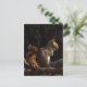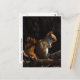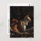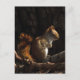 This postcard features a moment out of time. A beautiful red squirrel is sitting on a branch in a patch of sunlight in front of the dark textured bark of a wild cherry tree.