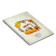 Spiral notebook with a cute squirrel standing behind some orange watercolor pumpkins. A foliage wreath surrounds them with an oak leaf and orange flowers and other sprigs and leaves. Background is a cream colour, with a rough aged look around the edges.