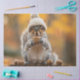 A delightful image of a gray squirrel sporting a whimsical, hand-knit cream-colored hat with a fluffy pom-pom. The squirrel clutches a nut tightly in its paws, its eyes bright and curious. The scene is set on a rustic tree stump surrounded by a scattering of fallen nuts, hinting at the abundance of autumn. The warm, golden hues of the background foliage evoke a cozy autumnal forest setting, creating a charming and heartwarming wildlife portrait.