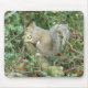 This cute mousepad features a photograph of a cute fluffy grey squirrel clutching an acorn and sitting in a tree in the forest.