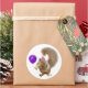 A squirrel with a party hat holds a purple balloon. This fun birthday sticker would make a fun gift tag.