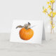A little squirrel holds up a sword from the top of a large orange pumpkin on this fun Halloween card, add your own words to customize.