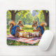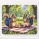 Two squirrels with blue backpacks are playing chess on a red and white chequered blanket in a sunlit park